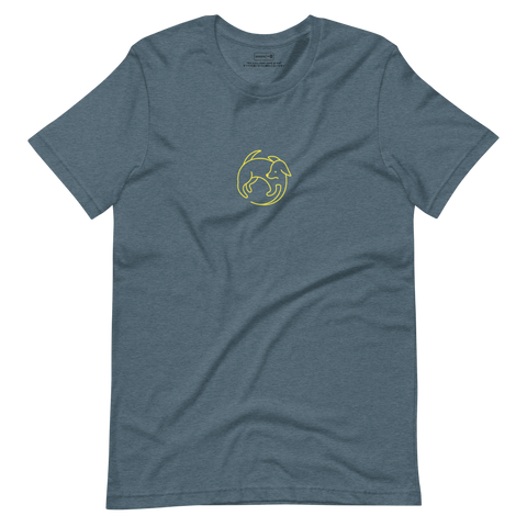 Minimalist line drawing of a dog chasing its tail in a circular motion on Heather Slate shirt