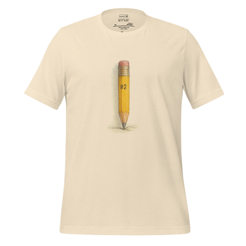This unisex tee features a hand-drawn colored pencil illustration of a battered #2 pencil—its wood shaved unevenly, lead blunt, eraser rubbed flat. A tribute to the imperfect tools that quietly shape everything we write and erase.