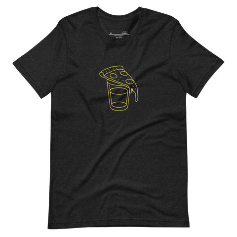 A single-line drawing of a pizza slice resting on the rim of a shot glass. Nothing more, nothing less.