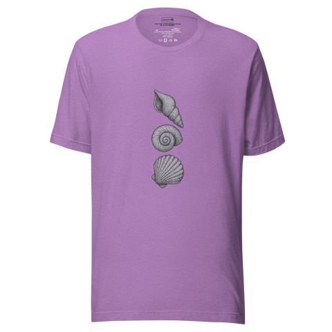 A cluster of three seashells — each drawn in delicate pointillist dots — sits low and quiet on the chest. Spirals, curves, and ridges emerge from texture rather than line, like fossils remembered in sand. The composition is light, imperfect, intentional.
