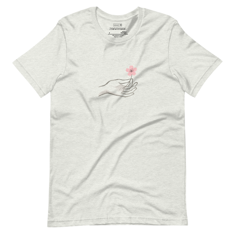 This unisex staple tee illustrates kindness through one gesture: a hand extending a sakura flower. Rendered in Japanese ink wash with a soft pink accent, it’s a minimal design that carries warmth, gentleness, and the poetry of giving.