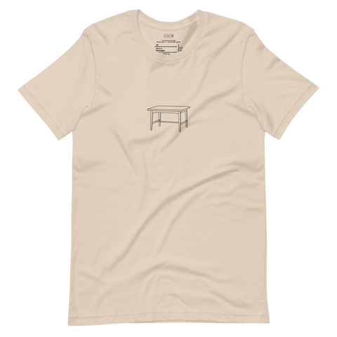 “Table Quiet” is about presence — the kind that doesn’t ask for attention. A wooden table, reduced to lines, becomes a gesture of holding: meals, hands, time, silence. No clutter, no noise. Just structure and stillness. This is the shape of pause; a surface that listens. It’s a shirt for those who make space without filling it.