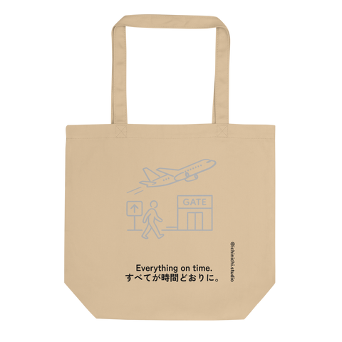 Minimalist airport-inspired Eco Tote Bag design representing perfect travel timing and calm early departures.