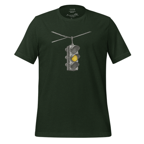 Minimalist T-Shirt design featuring a single flashing yellow street light suspended at an empty intersection at night.