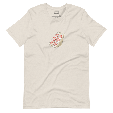 A study of the iconic Ichigo Sando, the beloved Japanese strawberry cream sandwich, captured in its most perfect cross-sectioned state. This short sleeve t-shirt celebrates the geometric precision of fresh strawberries and whipped cream tucked between pillowy shokupan bread.