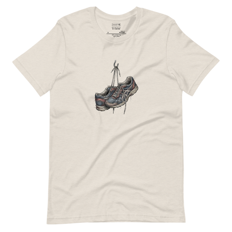 A pair of well-loved running sneakers, laces tied together, hangs heavily from a single hook. The treads are worn smooth and the fabric is frayed, serving as a quiet testament to the discipline of daily practice and the physical distance traveled on this unisex t-shirt. There is a profound beauty in exhaustion; these shoes have served their purpose fully, earning their retirement and the silence that follows the long run.
