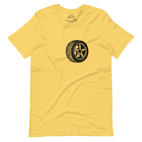 A minimalist yet detailed illustration of a car wheel — clean tire tread, stylized rim spokes, and subtle shading to give it depth. Rendered in monochrome line work with selective color accents on the rim (like a pop of red or yellow). The design is centered and symmetrical, capturing the motion and stillness of a wheel at the same time.