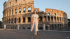 A cinematic capture of the Drifting Circles Tee against the historic backdrop of the Roman Colosseum. Features a Scandi-cool aesthetic and soft golden lighting, highlighting the versatility of the muted geometric design.