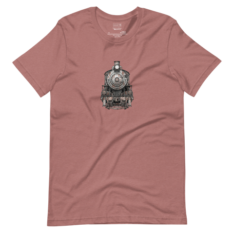 このデザインは、レトロな蒸気機関車を正面から捉えた、ストイックな視点が特徴で、ネガティブスペースから浮かび上がっています。インダストリアルなノスタルジアと、機械のフェイスのミニマルな幾何学的形状が交差する様を捉え、着用者に歴史の息吹を感じさせます。