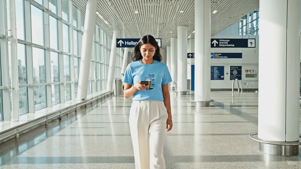 A clean, cinematic look at our signature airport-themed tee, set within the bright, modern expanse of Helsinki Airport. The actor’s comfortable, minimalist styling perfectly complements the shirt's relaxed, early-morning travel aesthetic.