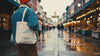 A cinematic capture of urban exploration in Seattle's Pike Place Market. The vintage traveler aesthetic highlights the tote's technical paper plane design, perfectly blending architectural dreams with everyday utility.