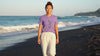 An elevated lifestyle visual featuring the Tide Memory T-shirt against the dramatic landscape of Maui's black sand beaches. This concept highlights the shirt’s artistic seashell graphics through a calm, coastal aesthetic that resonates with nature lovers and travelers.