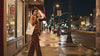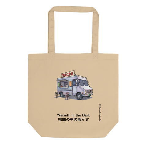 A sophisticated evening stroll through Los Angeles capturing the mood of late-night wanderings. The warm jazz atmosphere perfectly complements the watercolor taco truck design, highlighting the tote as an essential companion for the modern urbanite.