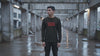 An elevated, cinematic look at the PEBKAC ERROR long sleeve in a tech-industrial setting. Features detailed close-ups of the distressed red typography and the raw cotton texture.
