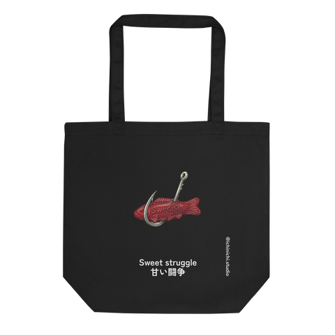This eco tote bag carries the weight of this absurd prize. The sharp lines of the hook contrasted with the soft form of the candy sit starkly on the organic canvas, turning the bag into a creel for modern, artificial foraging.