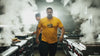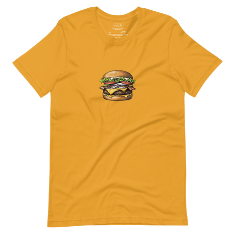 A seasoned chef navigates the intensity of a professional kitchen while wearing our signature burger graphic tee. Captures the authentic energy of culinary craftsmanship in a bold mustard yellow palette.
